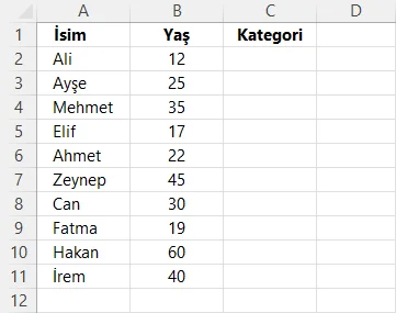 - Yaş 18 ve altı ise, Kategori (C sütunu) "Genç" olarak atanır.